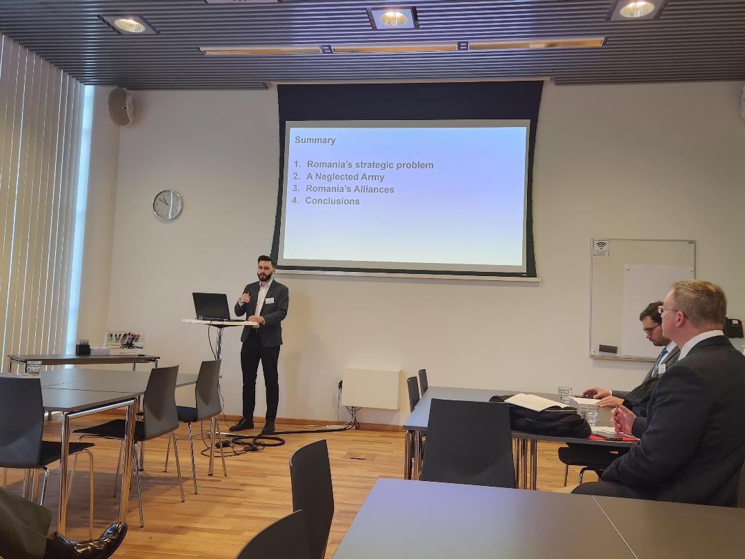 În perioada 6-8 noiembrie 2023, Vlad-Cristian Gheorghiță, asistent de cercetare în cadrul Institutului pentru studii politice de apărare și istorie militară, a participat la cea de-a 14-a conferință a Societății Internaționale de Științe Militare. Evenimentul desfășurat la Copenhaga a fost organizat de Colegiul Regal Danez de Apărare, având tema „Defence Alliances and Partnerships”. Reprezentantul ISPAIM a prezentat lucrarea „Overreliance on Alliances: Romania’s Failed Security Strategy in the Interwar Period”.